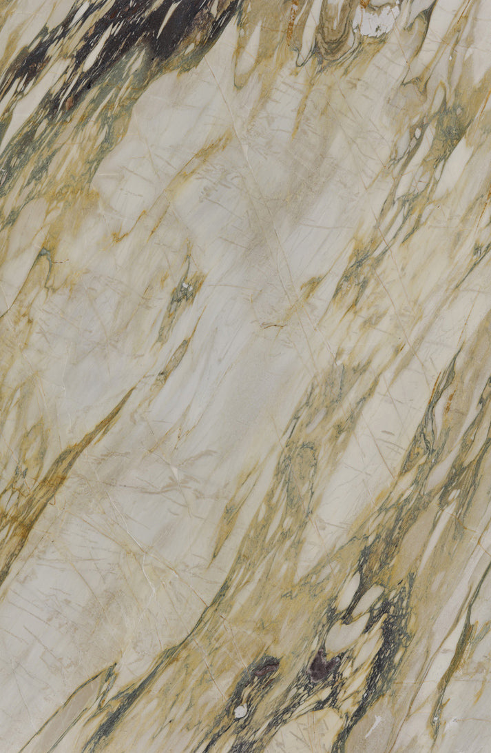 Calacatta Monet Marble is admired for its painterly blend of purple, gold, and grey veining, creating a dramatic and luxurious visual impact. Its unique coloration makes it a standout choice for feature walls, vanities, and high end interior designs.