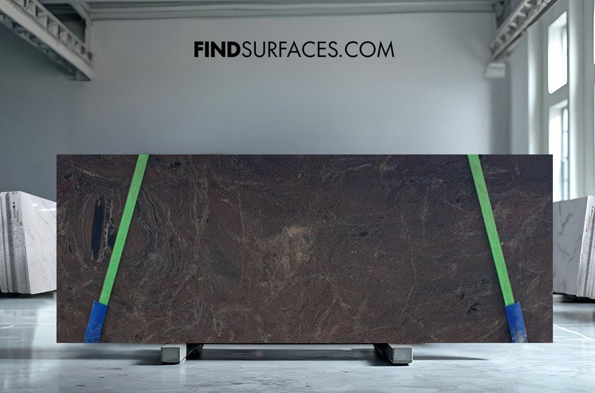 Paradiso Classico Granite features flowing patterns in deep purples and greys, perfect for bold surface designs.
