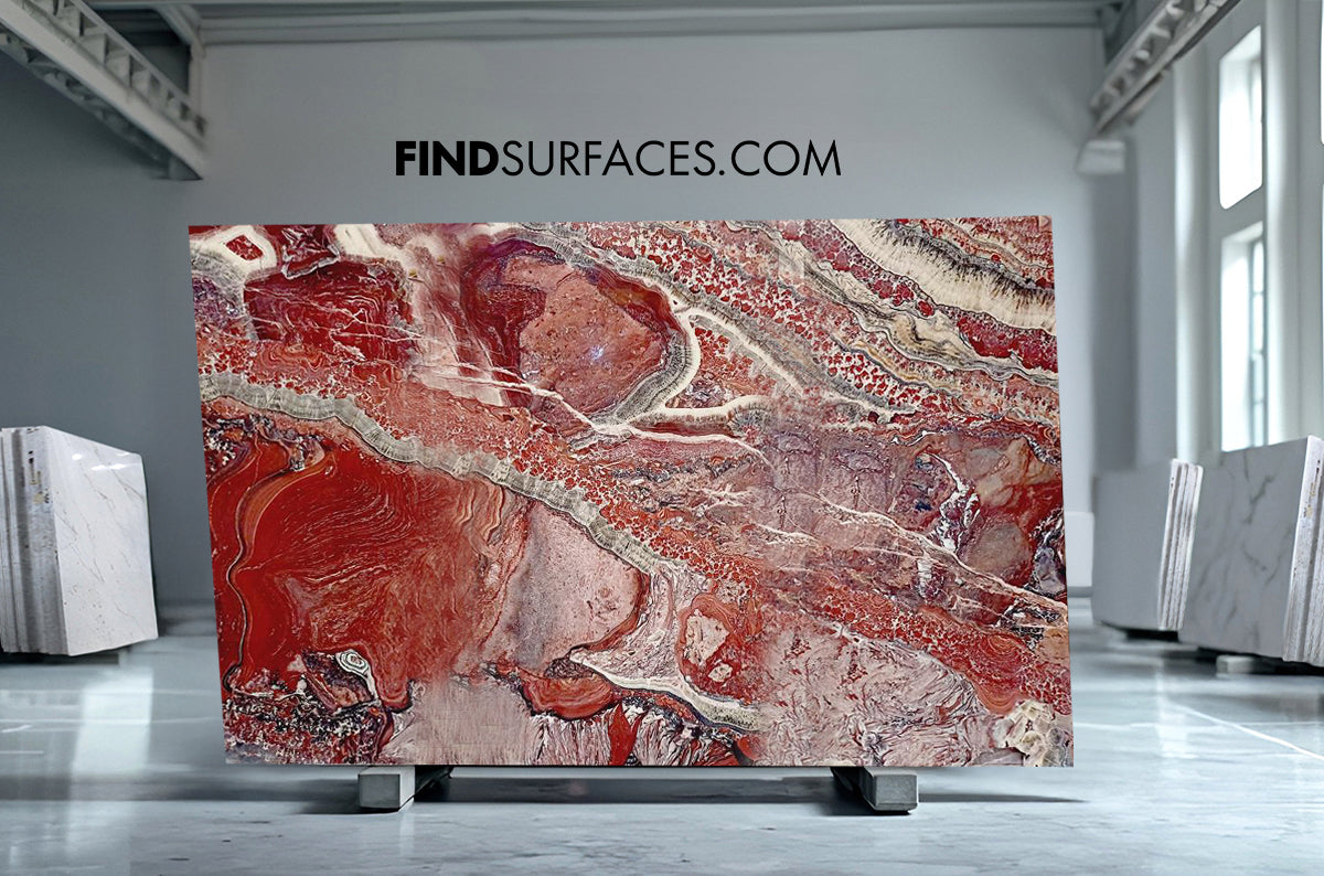 Red Onyx’s bold pattern and rich colour palette bring drama and strength to high-end interiors.